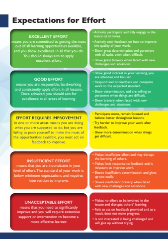 Page 09 Expectations for EffortEXCELLENT EFFORTmeans you are committed to getting the most out of all learning opportunities available, and you show excellence in all that you do. You should always aim to apply excellent effort. GOOD EFFORTmeans you are responsible, hardworking and consistently apply effort in all lessons. Once achieved, you should aim for excellence in all areas of learning.INSUFFICIENT EFFORTmeans that you are inconsistent in your level of effort. The standard of your work is below minimum expectations and requires intervention to improve.UNACCEPTABLE EFFORTmeans that you need to significantly improve and you will require extensive support or intervention to become a more effective learner.%u2022 Actively participate and fully engage in the lesson at all times.%u2022 Actively seek feedback on how to improve the quality of your work.%u2022 Show great determination and persevere with all tasks, even when difficult.%u2022 Show great bravery when faced with new challenges and situations.%u2022 Show good interest in your learning, you are attentive and focused.%u2022 Respond well to feedback and complete work to the expected standard.%u2022 Show determination, and are willing to persevere when things are difficult.%u2022 Show bravery when faced with new challenges and situations.%u2022 Participate more, remain focused and behave better throughout lessons.%u2022 Try harder to improve your work after feedback.%u2022 Show more determination when things get difficult.%u2022 Makes insufficient effort and may disrupt the learning of others.%u2022 Makes little response to feedback and is reluctant to improve work.%u2022 Shows insufficient determination and gives up too easily.%u2022 Shows insufficient bravery when faced with new challenges and situations.%u2022 Makes no effort to be involved in the lesson and disrupts others%u2019 learning.%u2022 Fails to act on feedback provided and as a result, does not make progress.%u2022 Is not interested in being challenged and will give up without trying.