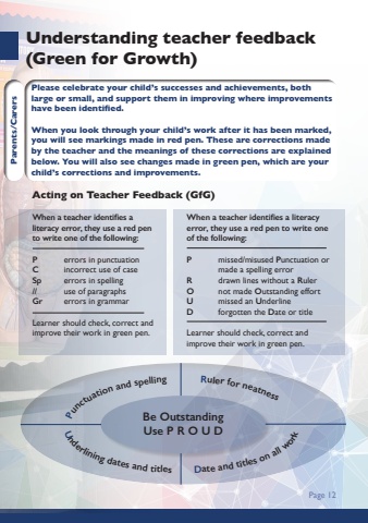 Page 12Acting on Teacher Feedback (GfG)When a teacher identifies a literacy error, they use a red pen to write one of the following:P errors in punctuation C incorrect use of case Sp errors in spelling // use of paragraphs Gr errors in grammar Learner should check, correct and improve their work in green pen. When a teacher identifies a literacy error, they use a red pen to write one of the following:P missed/misused Punctuation or made a spelling errorR drawn lines without a Ruler O not made Outstanding effortU missed an Underline D forgotten the Date or title Learner should check, correct and improve their work in green pen.Understanding teacher feedback (Green for Growth)Please celebrate your child%u2019s successes and achievements, both large or small, and support them in improving where improvements have been identified.When you look through your child%u2019s work after it has been marked, you will see markings made in red pen. These are corrections made by the teacher and the meanings of these corrections are explained below. You will also see changes made in green pen, which are your child%u2019s corrections and improvements.Be OutstandingUse P R O U DPunctuation and spelling Ruler for neatness Underlining dates and titles Date and titles on all workParents/Carers