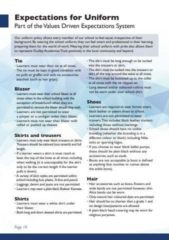 Page 19 Tie%u2022 Learners must wear their tie at all times.%u2022 The tie must be kept in good condition with no pulls or graffiti and with no accessories attached (such as hair grips).Blazer%u2022 Learners must wear their school blazer at all times when in the school building with the exception of break/lunch when they are permitted to remove the blazer should they wish.%u2022 Learners are not permitted to wear a jumper or a cardigan under their blazer.%u2022 Learners must not wear their blazer with rolled or pushed up sleeves.Skirts and trousers%u2022 Learners must only wear black trousers or skirts. Trousers should be tailored (not stretch) and full length.%u2022 If a learner wears a skirt it must reach at least the top of the knee at all times including when walking (it is unacceptable for the skirt only to be the correct length if the learner pulls it down).%u2022 A variety of skirt styles are permitted within school including box pleats, A-line and pencil.%u2022 Leggings, denim and jeans are not permitted.%u2022 Learners may wear a plain black Shalwar Kameze.Shirts%u2022 Learners must wear a white shirt under their blazer.%u2022 Both long and short sleeved shirts are permitted.%u2022 The shirt must be long enough to be tucked into the trousers or skirt.%u2022 The shirt must be tucked into the trousers or skirt all the way around the waist at all times.%u2022 The shirt must be buttoned up to the collar at all times with the tie clipped on.%u2022 Long sleeved and/or coloured t-shirts must not be worn under your school shirt.Shoes%u2022 Learners are required to wear formal, smart, black leather or patent shoes to school.%u2022 Learners are not permitted to wear trainers. This includes black leather trainers including those without markings.%u2022 School shoes should have no visible branding (whether the branding is in a different colour or black) including Nike ticks or sporting logos.%u2022 If you choose to wear black ballet pumps, these should be plain black without any accessories, such as studs.%u2022 Boots are not acceptable (a boot is defined as anything that touches or comes above the ankle bone).Hair%u2022 Hair accessories such as bows, flowers and wide bands are not permitted however; thin Alice bands can be worn.%u2022 Only natural hair coloured dyes are permitted.%u2022 Hair should be no shorter than a grade 1 and no design lines/patterns are allowed.%u2022 A plain black head covering may be worn for religious purposes.Expectations for Uniform Part of the Values Driven Expectations SystemOur uniform policy allows every member of our school to feel equal, irrespective of their background. By wearing the school uniform, they can feel smart and professional in their learning, preparing them for the world of work. Wearing their school uniform with pride also allows them to represent Dudley Academies Trust positively in the local community and beyond.