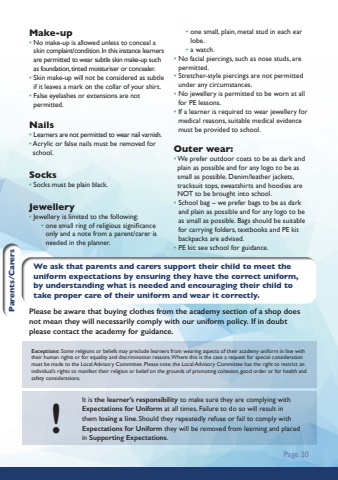 Page 20Make-up%u2022 No make-up is allowed unless to conceal a skin complaint/condition. In this instance learners are permitted to wear subtle skin make-up such as foundation, tinted moisturiser or concealer.%u2022 Skin make-up will not be considered as subtle if it leaves a mark on the collar of your shirt.%u2022 False eyelashes or extensions are not permitted.Nails%u2022 Learners are not permitted to wear nail varnish.%u2022 Acrylic or false nails must be removed for school.Socks%u2022 Socks must be plain black.Jewellery%u2022 Jewellery is limited to the following: %u2022 one small ring of religious significance only and a note from a parent/carer is needed in the planner. %u2022 one small, plain, metal stud in each ear lobe. %u2022 a watch.%u2022 No facial piercings, such as nose studs, are permitted.%u2022 Stretcher-style piercings are not permitted under any circumstances.%u2022 No jewellery is permitted to be worn at all for PE lessons.%u2022 If a learner is required to wear jewellery for medical reasons, suitable medical evidence must be provided to school.Outer wear:%u2022 We prefer outdoor coats to be as dark and plain as possible and for any logo to be as small as possible. Denim/leather jackets, tracksuit tops, sweatshirts and hoodies are NOT to be brought into school.%u2022 School bag %u2013 we prefer bags to be as dark and plain as possible and for any logo to be as small as possible. Bags should be suitable for carrying folders, textbooks and PE kit backpacks are advised.%u2022 PE kit: see school for guidance.Please be aware that buying clothes from the academy section of a shop does not mean they will necessarily comply with our uniform policy. If in doubt please contact the academy for guidance.Exceptions: Some religions or beliefs may preclude learners from wearing aspects of their academy uniform in line with their human rights or for equality and discrimination reasons. Where this is the case a request for special consideration must be made to the Local Advisory Committee. Please note; the Local Advisory Committee has the right to restrict an individual%u2019s rights to manifest their religion or belief on the grounds of promoting cohesion, good order or for health and safety considerations.!It is the learner%u2019s responsibility to make sure they are complying with Expectations for Uniform at all times. Failure to do so will result in them losing a line. Should they repeatedly refuse or fail to comply with Expectations for Uniform they will be removed from learning and placedin Supporting Expectations.We ask that parents and carers support their child to meet the uniform expectations by ensuring they have the correct uniform, by understanding what is needed and encouraging their child to take proper care of their uniform and wear it correctly. Parents/Carers