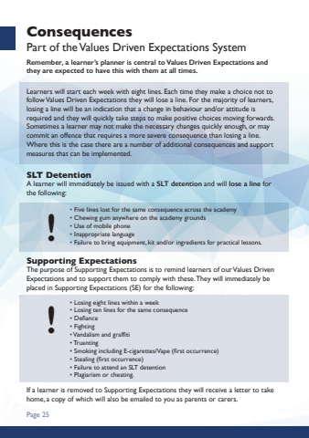 Page 25 ConsequencesPart of the Values Driven Expectations SystemRemember, a learner%u2019s planner is central to Values Driven Expectations and they are expected to have this with them at all times. SLT DetentionA learner will immediately be issued with a SLT detention and will lose a line for the following:Supporting ExpectationsThe purpose of Supporting Expectations is to remind learners of our Values Driven Expectations and to support them to comply with these. They will immediately be placed in Supporting Expectations (SE) for the following:If a learner is removed to Supporting Expectations they will receive a letter to take home, a copy of which will also be emailed to you as parents or carers.Learners will start each week with eight lines. Each time they make a choice not to follow Values Driven Expectations they will lose a line. For the majority of learners, losing a line will be an indication that a change in behaviour and/or attitude is required and they will quickly take steps to make positive choices moving forwards.Sometimes a learner may not make the necessary changes quickly enough, or may commit an offence that requires a more severe consequence than losing a line. Where this is the case there are a number of additional consequences and support measures that can be implemented.!!%u2022 Five lines lost for the same consequence across the academy%u2022 Chewing gum anywhere on the academy grounds%u2022 Use of mobile phone%u2022 Inappropriate language%u2022 Failure to bring equipment, kit and/or ingredients for practical lessons.%u2022 Losing eight lines within a week%u2022 Losing ten lines for the same consequence%u2022 Defiance%u2022 Fighting%u2022 Vandalism and graffiti%u2022 Truanting%u2022 Smoking including E-cigarettes/Vape (first occurrence)%u2022 Stealing (first occurrence)%u2022 Failure to attend an SLT detention%u2022 Plagiarism or cheating.