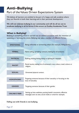 Anti-BullyingPart of the Values Driven Expectations SystemPage 27 We believe all learners are entitled to be part of a happy and safe academy where they can flourish in both their learning and in their personal development.We will not tolerate bullying in our community and will do all we can to eradicate bullying in all its forms if this occurs at Dudley Academies Trust.What is Bullying?Bullying is something which is carried out on several occasions with the intention of upsetting or harming the victim. Bullying can take a number of different forms:Falling out with friends is not bullying.EMOTIONALVERBALPHYSICALRACISTSEXUALBeing unfriendly or tormenting others (for example, hiding books).Name calling, spreading rumours, making fun of someone.Pushing, kicking, hitting, biting or spitting for example.Racial taunts, making fun of someone%u2019s race, colour, creed, culture or religion.Unwanted physical contact.HOMOPHOBICGENDERONLINE/CYBERTargeting someone because of their sexuality or focusing on the issue of sexuality.Targeting someone because of their gender.Setting up hate websites, posting hateful comments, offensive messages sent via text, social media or email for example.