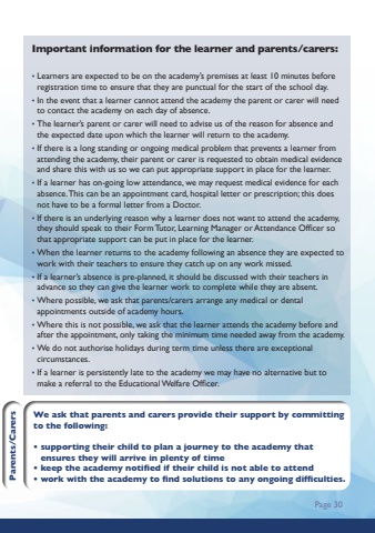 Page 30Important information for the learner and parents/carers:%u2022 Learners are expected to be on the academy%u2019s premises at least 10 minutes before registration time to ensure that they are punctual for the start of the school day.%u2022 In the event that a learner cannot attend the academy the parent or carer will need to contact the academy on each day of absence.%u2022 The learner%u2019s parent or carer will need to advise us of the reason for absence and the expected date upon which the learner will return to the academy.%u2022 If there is a long standing or ongoing medical problem that prevents a learner from attending the academy, their parent or carer is requested to obtain medical evidence and share this with us so we can put appropriate support in place for the learner.%u2022 If a learner has on-going low attendance, we may request medical evidence for each absence. This can be an appointment card, hospital letter or prescription; this does not have to be a formal letter from a Doctor.%u2022 If there is an underlying reason why a learner does not want to attend the academy, they should speak to their Form Tutor, Learning Manager or Attendance Officer so that appropriate support can be put in place for the learner.%u2022 When the learner returns to the academy following an absence they are expected to work with their teachers to ensure they catch up on any work missed.%u2022 If a learner%u2019s absence is pre-planned, it should be discussed with their teachers in advance so they can give the learner work to complete while they are absent.%u2022 Where possible, we ask that parents/carers arrange any medical or dental appointments outside of academy hours.%u2022 Where this is not possible, we ask that the learner attends the academy before and after the appointment, only taking the minimum time needed away from the academy.%u2022 We do not authorise holidays during term time unless there are exceptional circumstances.%u2022 If a learner is persistently late to the academy we may have no alternative but to make a referral to the Educational Welfare Officer.We ask that parents and carers provide their support by committing to the following:%u2022 supporting their child to plan a journey to the academy that ensures they will arrive in plenty of time%u2022 keep the academy notified if their child is not able to attend%u2022 work with the academy to find solutions to any ongoing difficulties.Parents/Carers