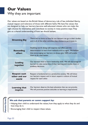 Our Values Why they are importantPage 03 Our values are based on the British Values of democracy, rule of law, individual liberty, mutual respect and tolerance of those with different faiths. We have five values that are designed to help our learners become well-educated citizens who can make the right choices for themselves and contribute to society in many positive ways. They give us a shared understanding of how we should behave.Rewarding effortLeading togetherRespect each other and our worldLearning that inspiresAnything worth doing well requires real effort and the determination to learn from setbacks and try again. We believe that encouraging our learners to always give 100% will enable them to do even better. Our learners need to learn leadership skills. We will encourage all learners to take ownership of their learning and involve them in academy decisions. Respect is fundamental to a productive society. We will show our learners respect and in return expect a culture of mutual respect for each other. Our learners deserve the best education that we can provide. We will promote positive attitudes so learning is inspirational. There are no limits to how far our learners can go in their studies and in all of the other activities they choose to participate in. Dreaming BigWe ask that parents or carers support by:%u2022 Helping their child to understand the values, how they apply to what they do and how they do it.%u2022 Encouraging their child to respect these values. Parents/Carers