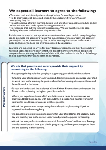 Page 06We expect all learners to agree to the following:%u2022 To understand and abide by the academy%u2019s Values Driven Expectations. %u2022 To do their best at all times and embody the academy%u2019s five Core Values in everything they do.%u2022 To apply positive effort in learning, behave well, and show respect to all adults and all other learners who make up our learning community.%u2022 To recognise that bullying is totally unacceptable. We ask that they act to stop bullying wherever and whenever they witness this.Each learner is asked to set a positive example to their peers and do everything they can to promote the academy%u2019s values. We expect learners to represent the academy positively in the local community; this includes wearing the correct uniform with pride and helping to keep the environment as tidy as possible.Learners are expected to arrive for every lesson prepared to do their best work, try hard and apply good (or better) effort. We expect them to bring their equipment, complete home learning to the best of their ability, be resilient in the face of challenge and do everything they can to learn and progress.We ask that parents and carers provide their support bycommitting to the following:%u2022 Recognising the key role that you play in supporting your child and the academy.%u2022 Checking your child%u2019s planner each week and doing all you can to encourage your child to work hard in the academy, be positive about his/her learning, develop resilience and be ambitious for the future.%u2022 To read and understand the academy%u2019s Values Driven Expectations and support the Trust%u2019s staff in upholding the highest possible standards.%u2022 Where you experience issues which you believe are a cause for concern, we ask that you address these quickly with the academy in a supportive manner, working in partnership to address concerns as swiftly as possible.%u2022 We ask that you commit to supporting the academy in implementing all policies approved by the Governing Body.%u2022 We expect you to do all you can to ensure that your child attends the academy every day and that they are in the correct uniform and properly equipped for learning.%u2022 We ask that every effort is made to attend all Parents/ Carers%u2019 and Learners%u2019 Evenings in order to understand how your child is progressing and how you can support them and the academy in their learning.Parents/Carers
